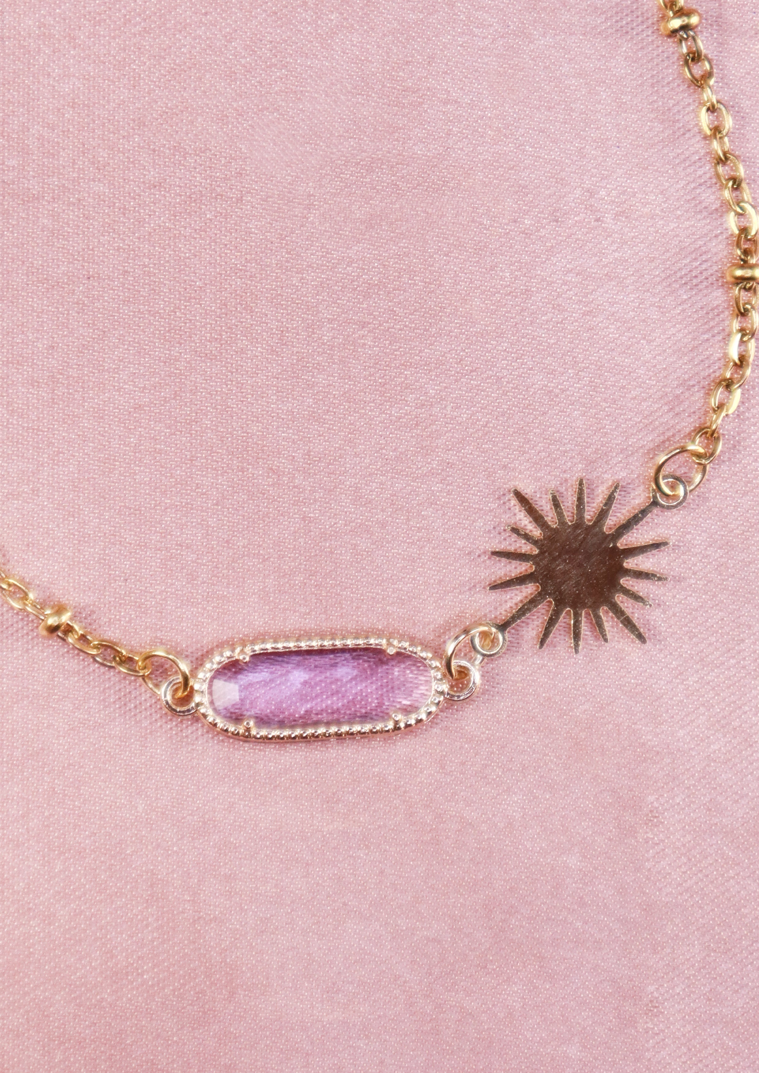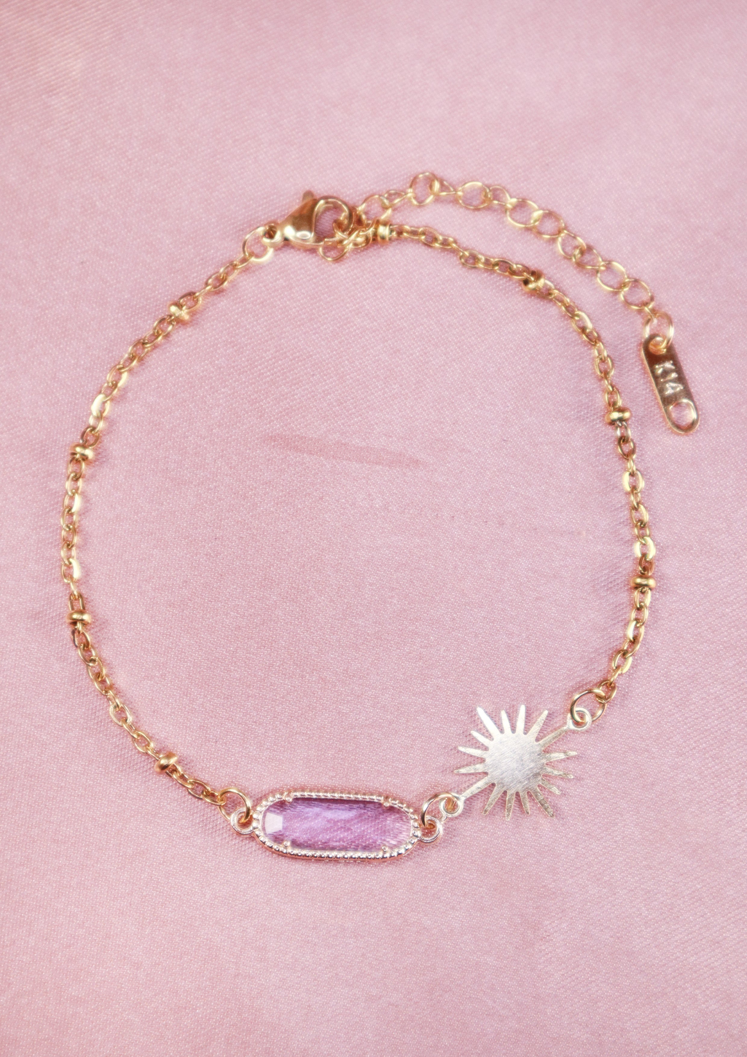 Ett stilrent guldfpläterat armband som utstrålar glamour, dekorerat med en skimrande lila glassten och guldig sol. Ett vackert smycke som lyfter din look.