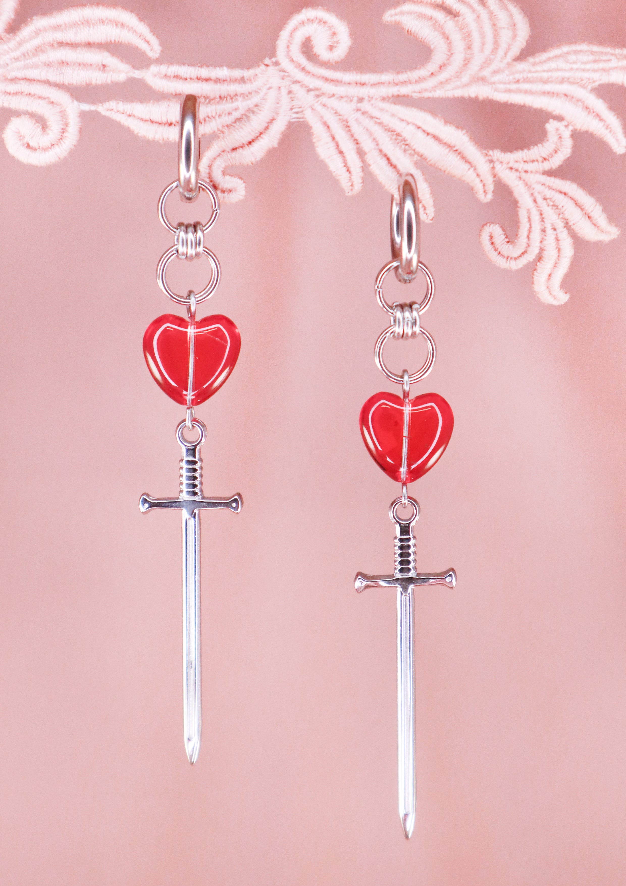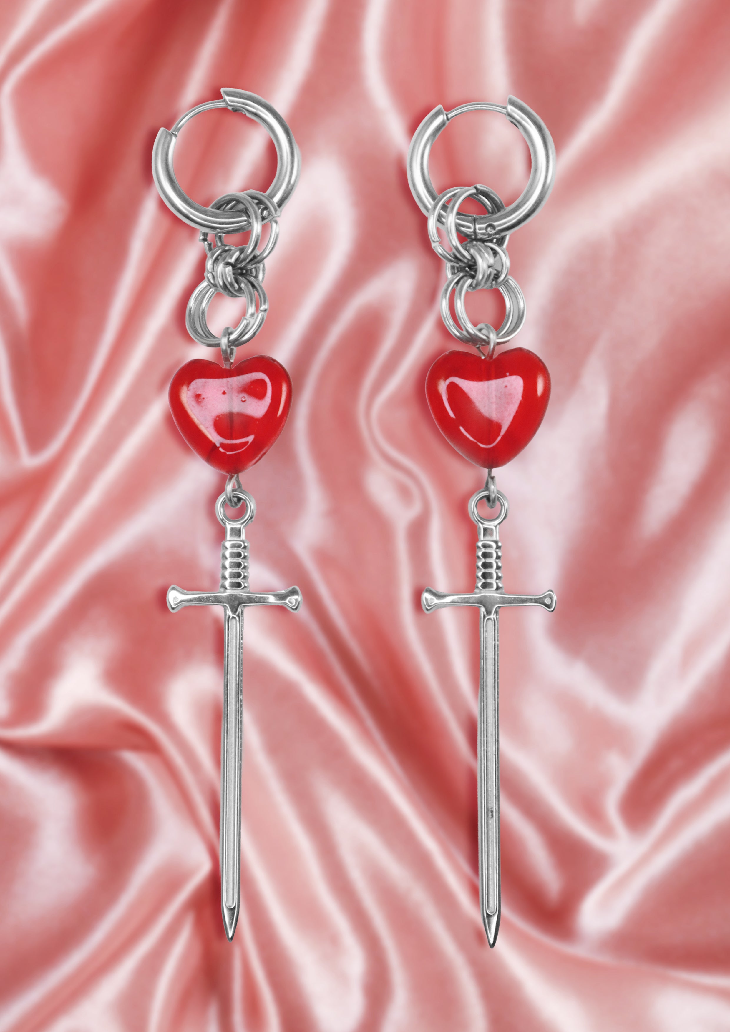 These unique hoops are crafted with a sturdy chainmail design, giving them an edgy and sleek appearance. In the center hangs a beautiful red glass heart, symbolizing the fire of love, along with a sword representing courage and strength.