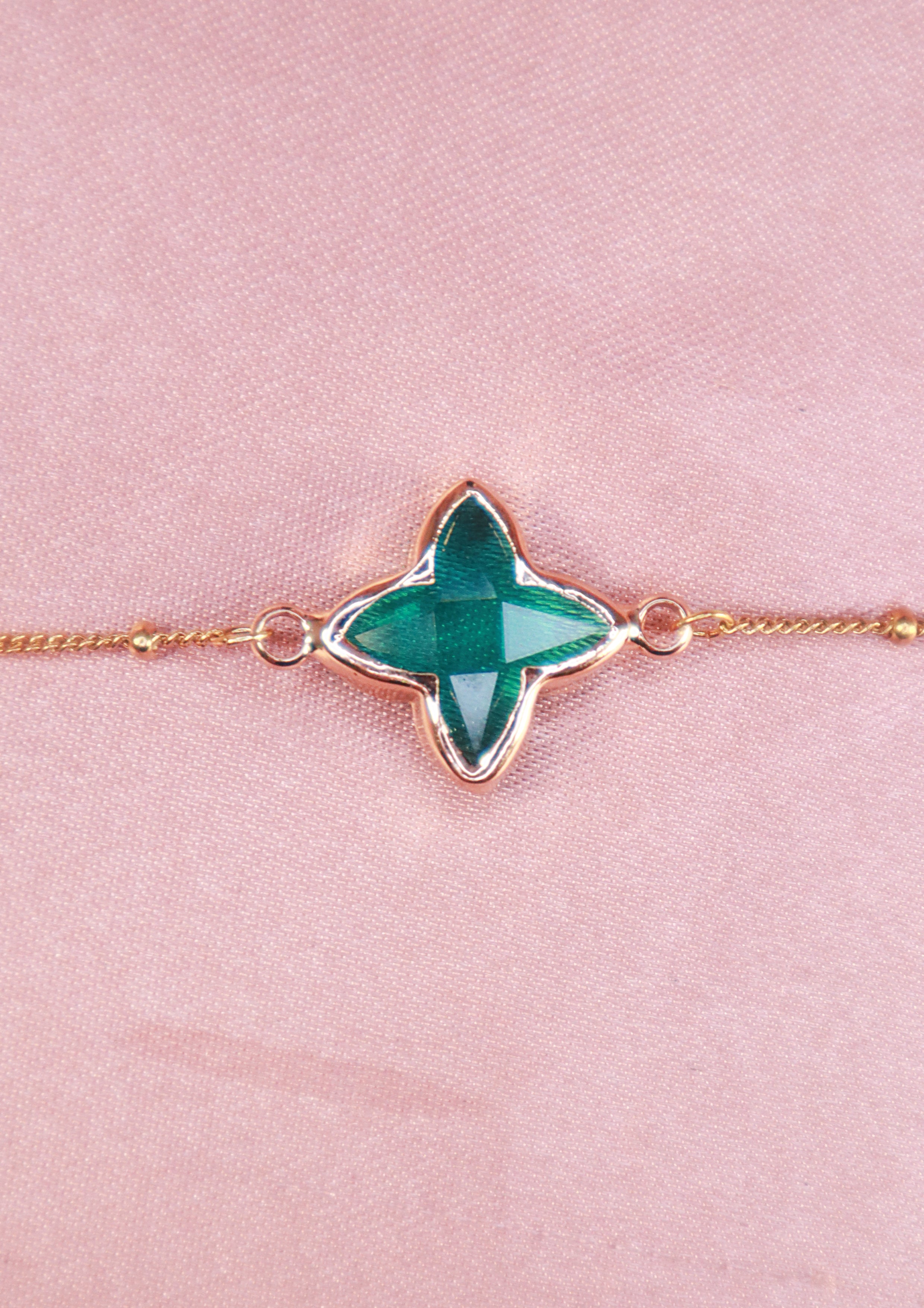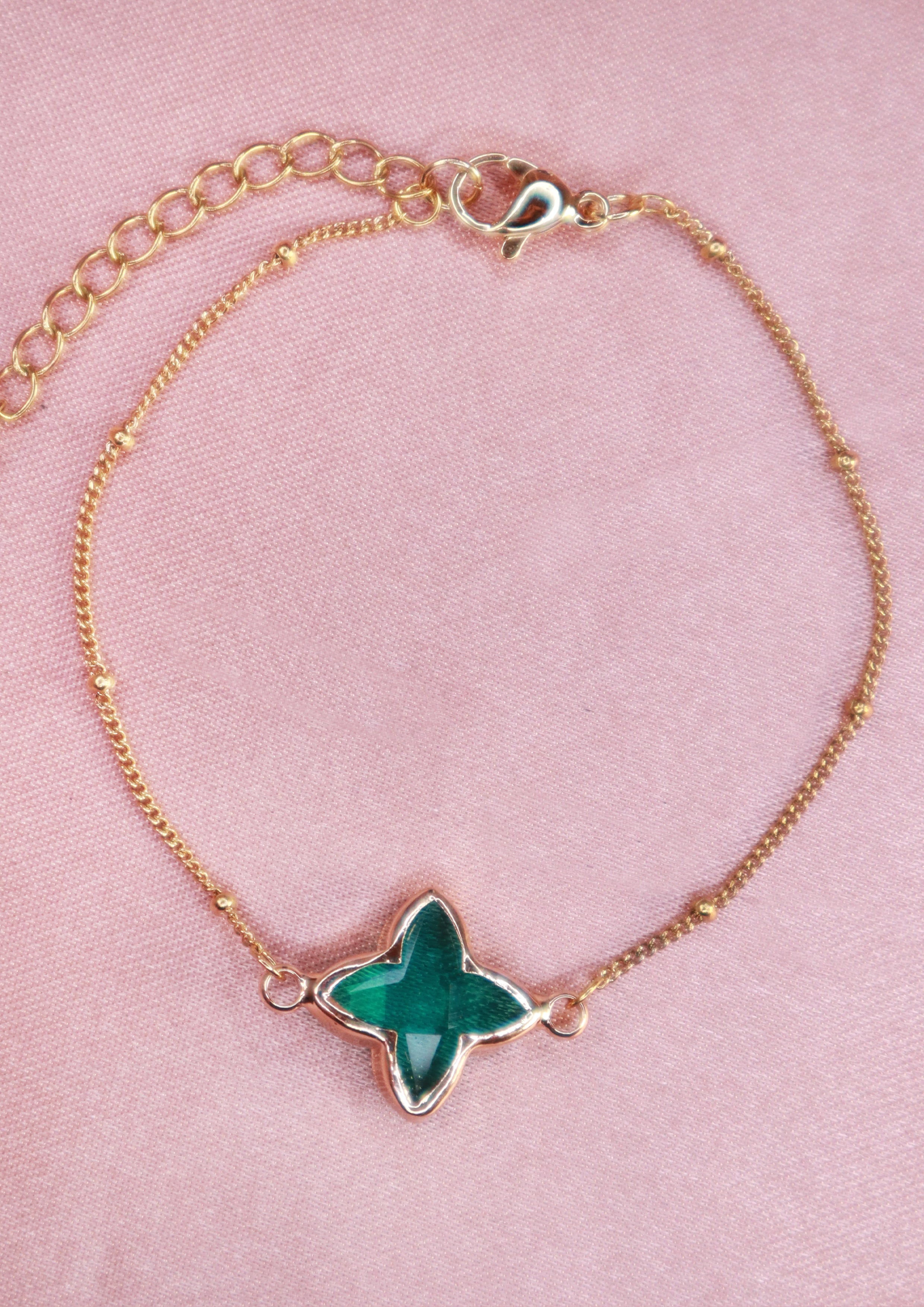 Ett stilrent guldfpläterat armband som utstrålar glamour, dekorerat med en skimrande grön glassten. Ett vackert smycke som lyfter din look.