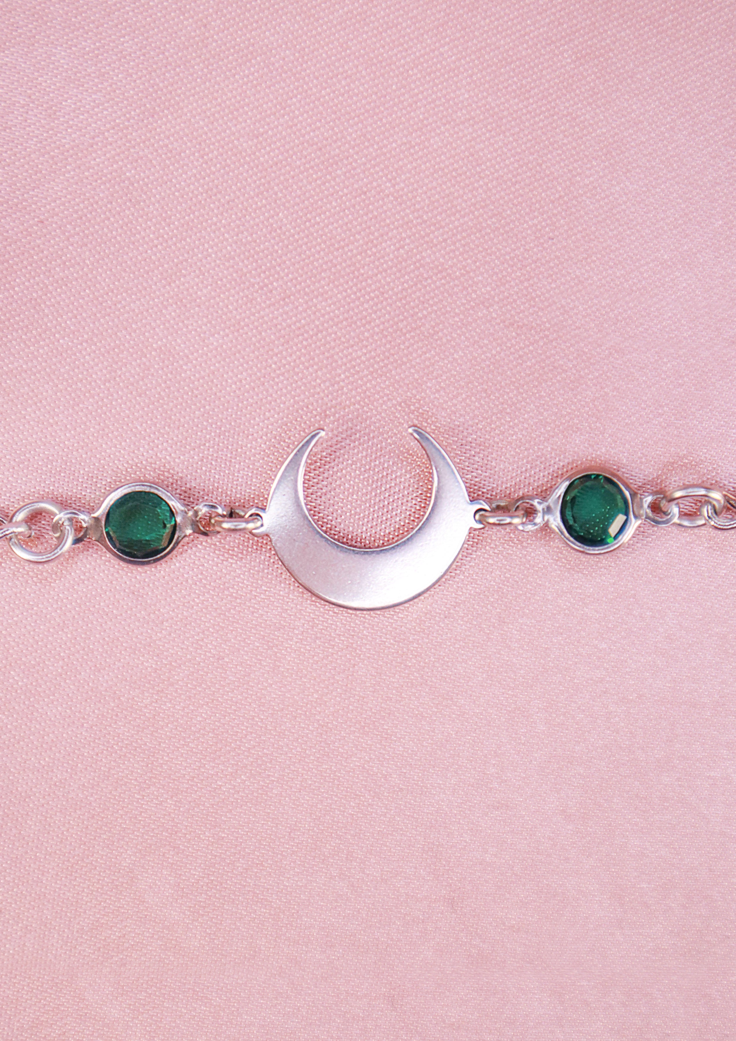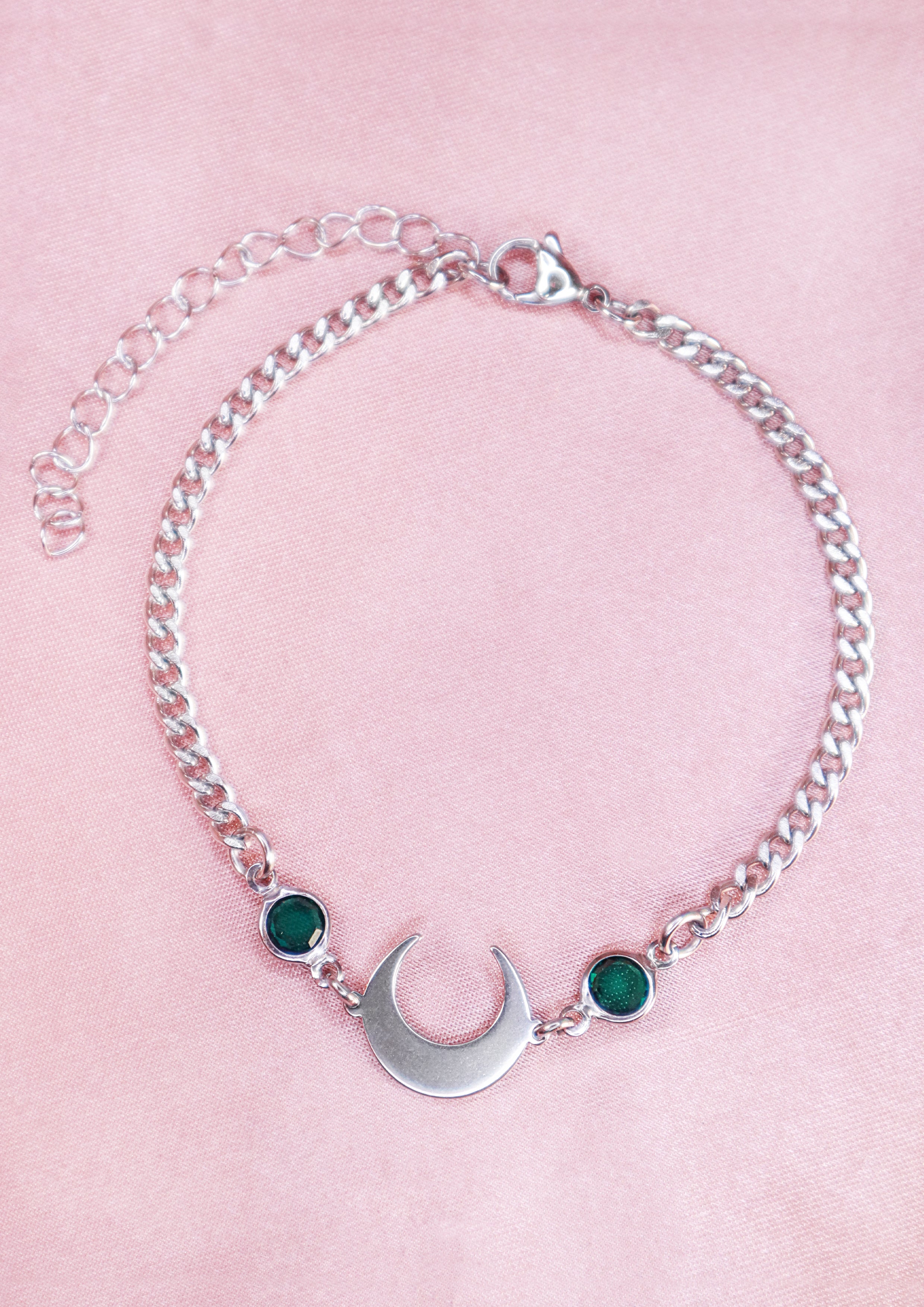 An elegant bracelet with a charming moon and two dark green glass stones, adding a subtle and mysterious touch to your style.