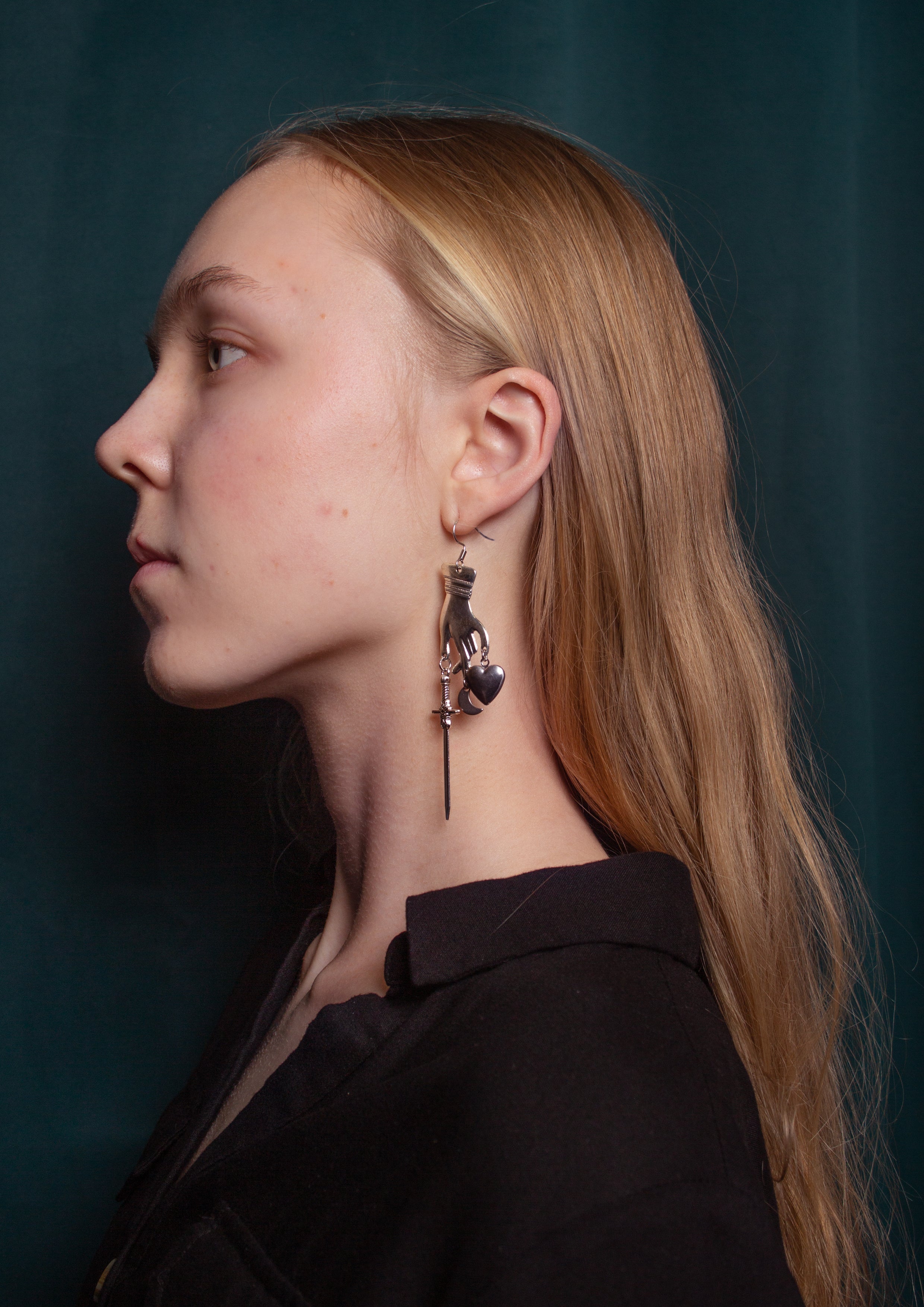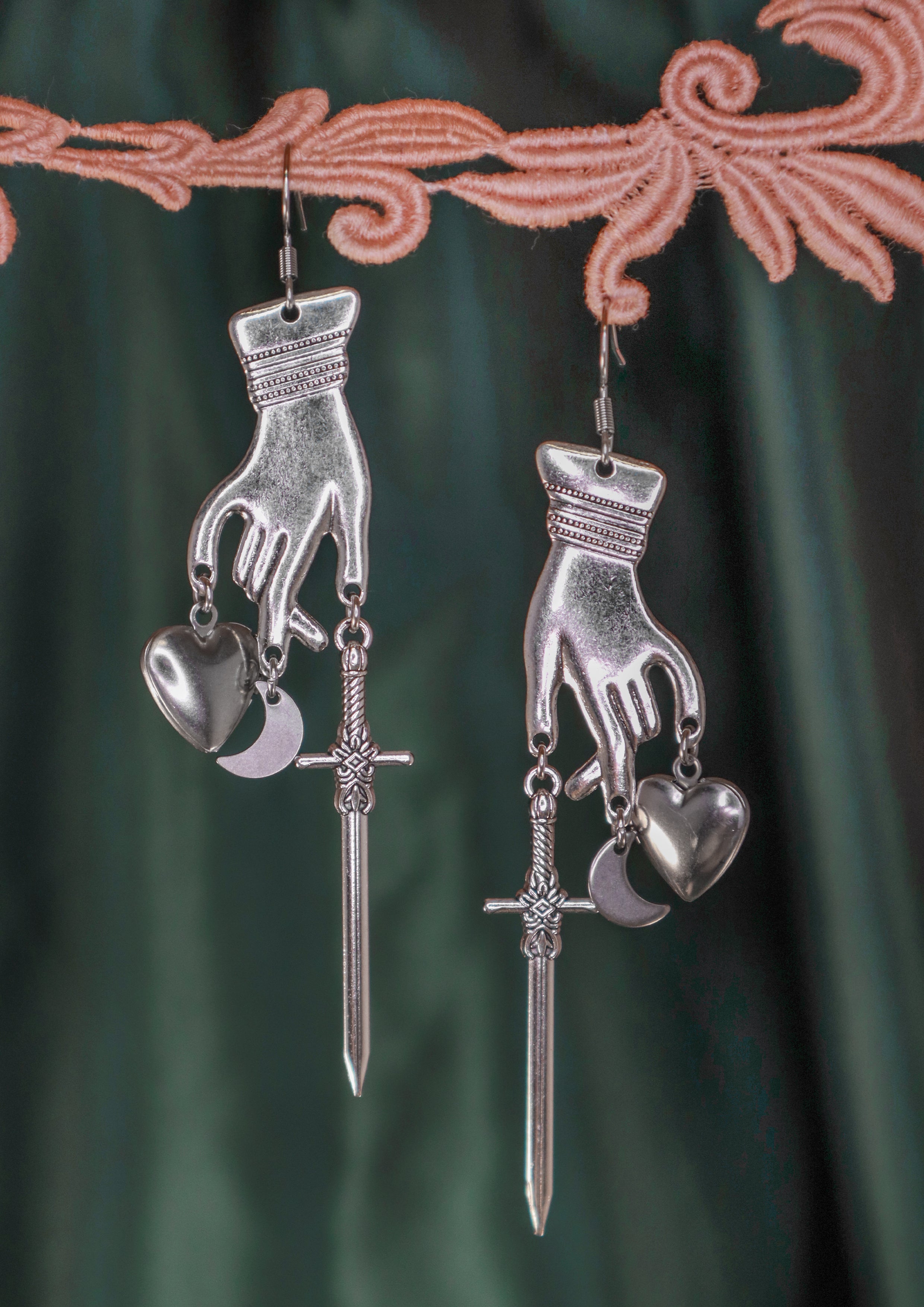Lyft din look med våra fantastiska Divine Balance Earrings, en unik blandning av konstnärskap och symbolik. Dessa örhängen har en intrikat designad hand, och från den dinglar ett vackert svärd som symboliserar styrka och mod, samt fångar essensen av en krigaranda.
