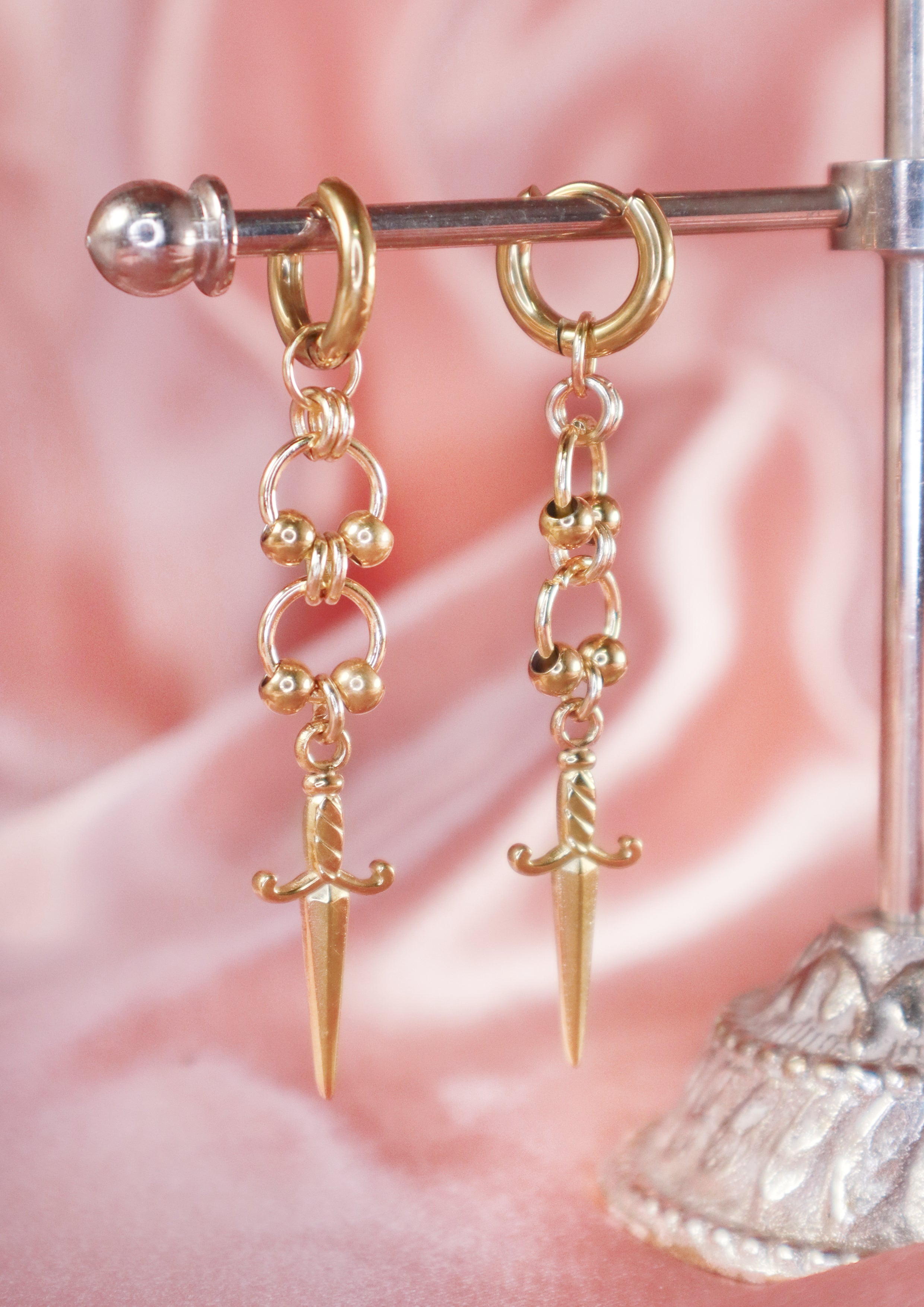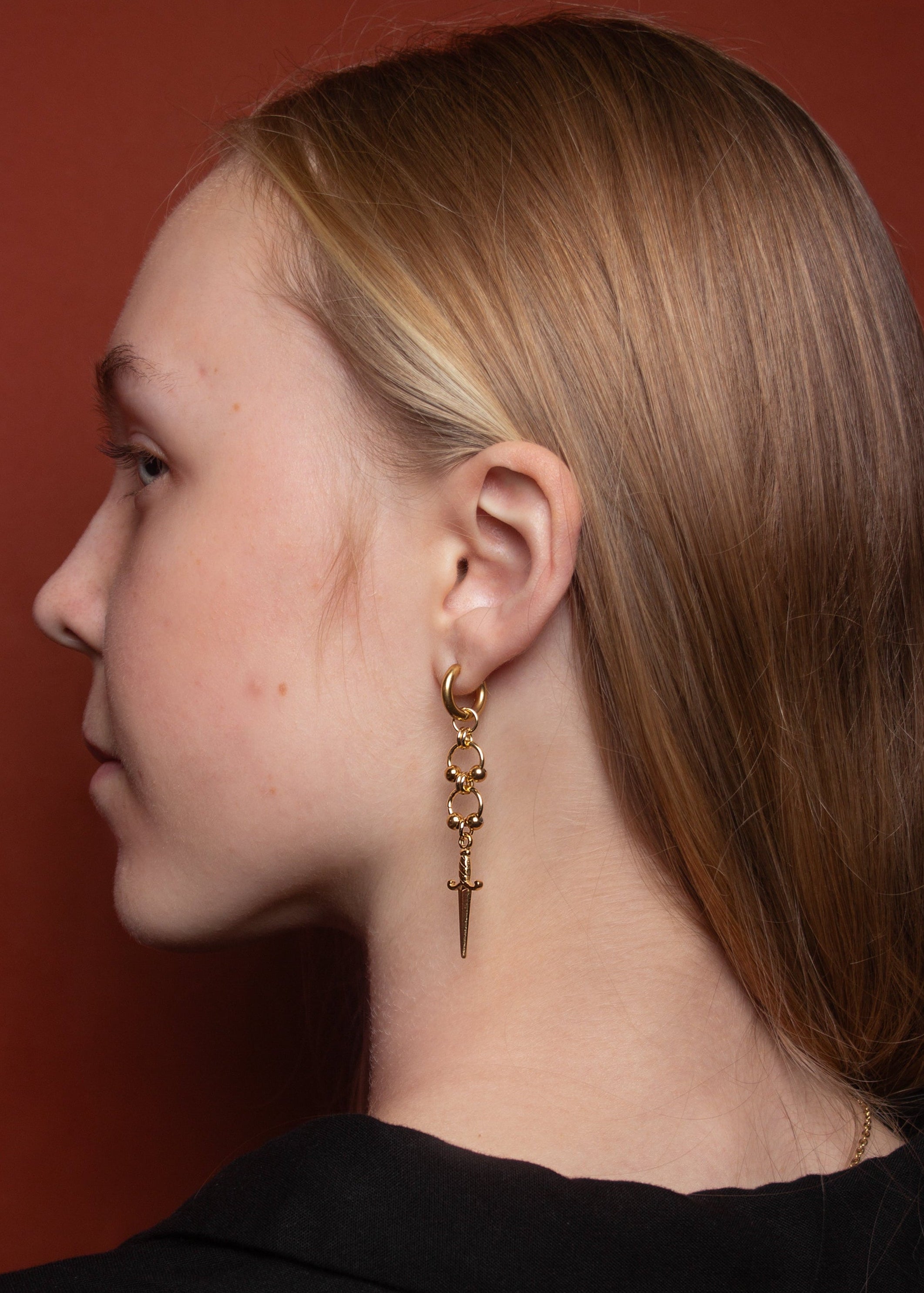 Discover the elegance of our golden sword hoop earrings on chain! A perfect detail that combines strength and sophistication. These charming earrings make a statement for those who want to wear something unique and stylish.