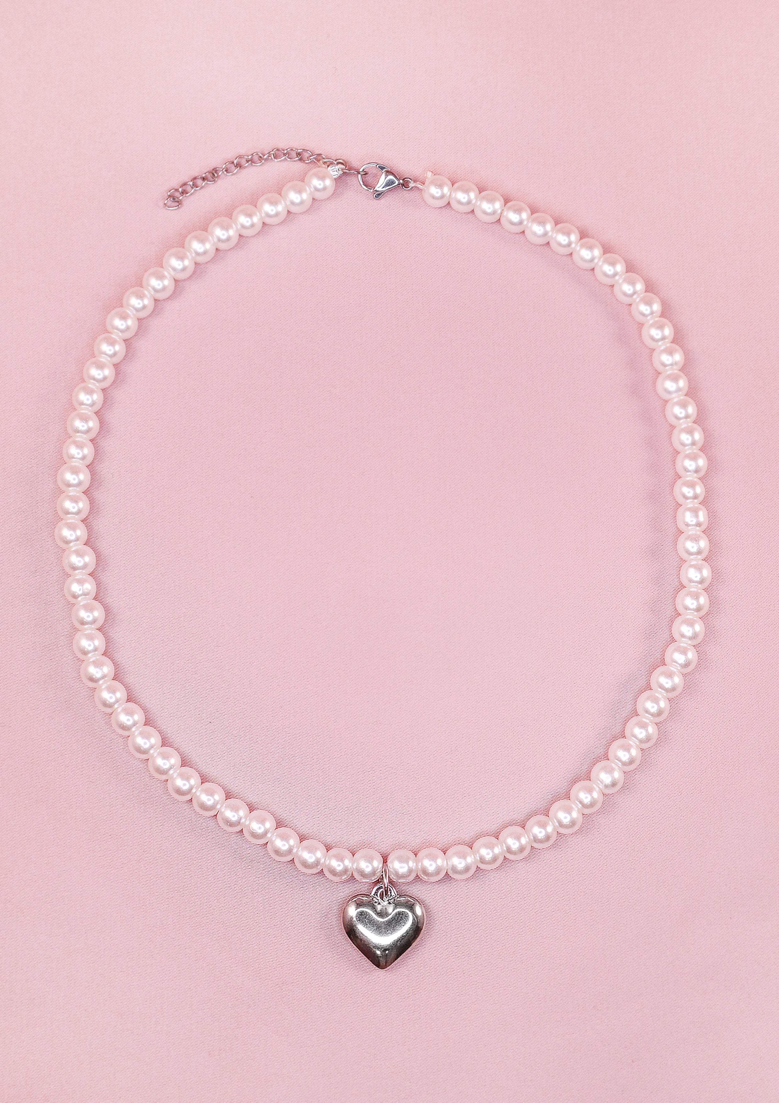 Charm size: 2x1,7 cm, stainless steel. The pearl necklace measures 40 cm with a 4 cm extension chain.